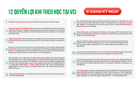 Với định hướng đào tạo gắn liền thực tiễn, mở rộng hợp tác quốc tế và chính sách hỗ trợ toàn diện, Trường Cao đẳng Công Thương Việt Nam tiếp tục khẳng định vị thế là môi trường học tập năng động, hiện đại, giúp sinh viên tự tin lập thân, lập nghiệp và hội nhập toàn cầu. Để tìm hiểu thêm về 53 ngành cao đẳng chính quy và các cơ hội học bổng hấp dẫn cũng như cách thức nhập học tại Trường Cao đẳng Công Thương Việt Nam, xin mời quý phụ huynh và các em học sinh truy cập tại đường link: https://vci.edu.vn/tuyen-sinh-cao-dang-chinh-quy để biết thêm chi tiết.